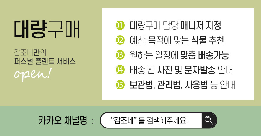 | 기타 특이사항 | 고객센터와 연락없이 임의로 반품을 보낼 경우 식물이 파손될 위험과 식물의 특성상 재판매가 불가능하기 때문에 반드시 고객센터로 연락주시면 빠른 처리 도와드리겠습니다. |